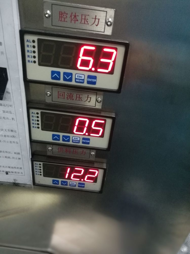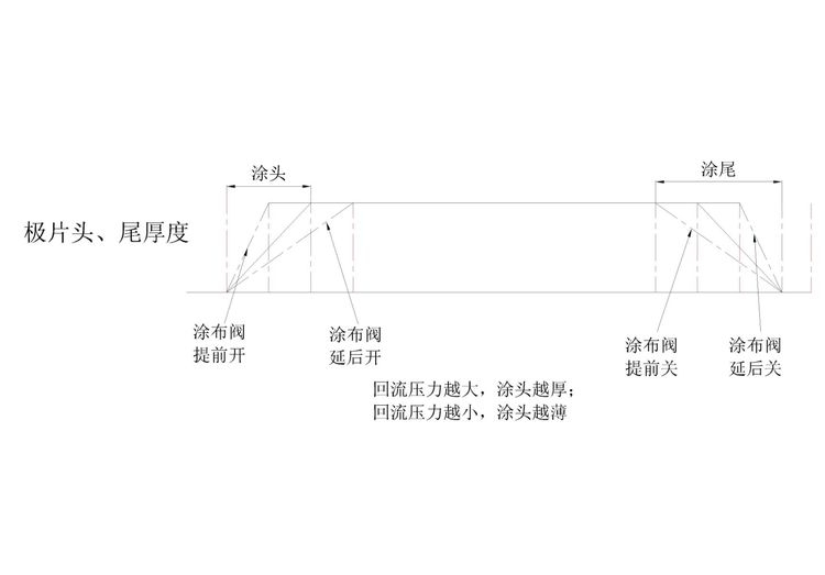 上圖情況是因為腔體壓力和回流壓力壓差太大,跳間隙料回流多了導(dǎo)致腔體壓力小,再啟涂時涂頭就薄了,解決方法:①關(guān)小些回流閥門讓涂布時腔體壓力與回流瞬間腔體壓力相持平或小于0.2就能保證頭部面密度與中間面密度一致的。