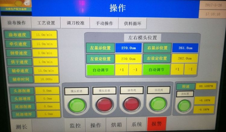 涂布模頭,如上圖所示,箔材經(jīng)過驅(qū)動背輥與擠壓頭之間的間隙繞過背輥向一個方向行進,擠壓頭間歇地向泊材涂覆漿料。頭厚,是因為模頭為了克服漿料的靜磨擦而采用的開始漿料瞬時壓力較高而產(chǎn)生的;拖尾,是漿料涂完后,由于漿料的流涎作用,而產(chǎn)生的涂長在收尾時產(chǎn)生的鋸齒狀的邊緣,為了解決厚頭和拖尾的問題,涂布系統(tǒng)控制方法包括以下步驟在模頭開始向泊材涂覆漿料時,擠壓模頭縫口處的漿料進行倒吸使?jié){料回流;依據(jù)該涂布方法,在開始涂布時,使擠壓頭中漿料在開始供料的瞬間微量回流,減少涂覆于基材上的漿料量,可以有效地控制間歇涂布頭部的厚度;而在間歇時即擠壓頭停止涂布時,同樣使擠壓頭中漿料瞬間回流,使涂覆在基體上的漿料可以迅速斷開,這樣有效地控制間歇時尾部拖尾的整齊度。從調(diào)試過程中結(jié)果來看,這種涂布方法對模頭腔體壓力控制要求非常高,如果控制稍有偏差,不但不能解決頭厚和拖尾的問題,反而還會適得其反。(所以對漿料粘度偏差不能太大)