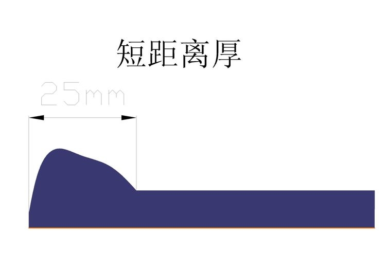 上圖情況是因為留白處的多余的漿料未能快速回流,即馬上要啟涂時多余的漿料在泊材與漿料接觸處會形成一個凸彎月面,彎月的曲率半徑越大,漿料下滴降過大會造成下彎月面不穩(wěn)定就會出現(xiàn)頭第一厚再薄再厚后正常如上圖所示情況。解決方法①更換薄墊片讓唇口彎月弧形變?、诩哟蠡亓鏖y芯內(nèi)徑尺寸讓漿料快速回流③調(diào)節(jié)間隙閥氣流增大讓閥打開速度快些。根據(jù)現(xiàn)場實際情況調(diào)節(jié)控制腔體壓力,回流壓力及間隙閥氣缸限流閥。